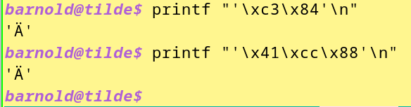 barnold@tilde$ printf "\xc3\x84" | wc --chars 1 barnold@tilde$ printf "\x41\xcc\x88" | wc --chars 2